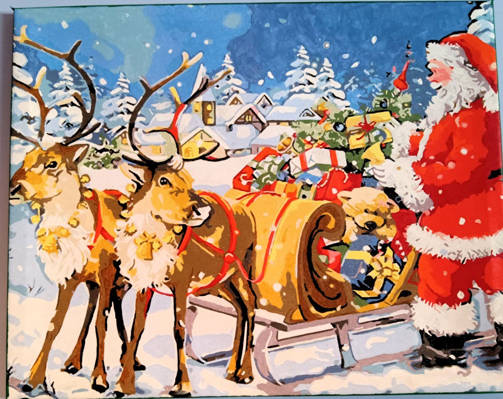 Möchten Sie Ihre eigene Weihnachts-Mal-nach-Zahlen-Leinwandkunst erstellen? Für viele Menschen ist dies die wichtigste Zeit des Jahres. Die Familien kommen zusammen und treffen sich. Jeder gibt sein Bestes, um die überraschendsten und großartigsten Weihnachtsgeschenke zu finden. Draußen ist es kalt, aber es schneit, und das macht die Atmosphäre so gemütlich und romantisch. Diese Zeit ist sehr besonders und wird auf viele Arten gefeiert. Unser Gemälde zeigt den Weihnachtsmann und seine Rentiere mit dem Schlitten voller Geschenke für Kinder. Es schneit und bedeckt die Dächer des nahegelegenen Dorfes mit Schnee. Was bringt er Ihnen dieses Mal?
