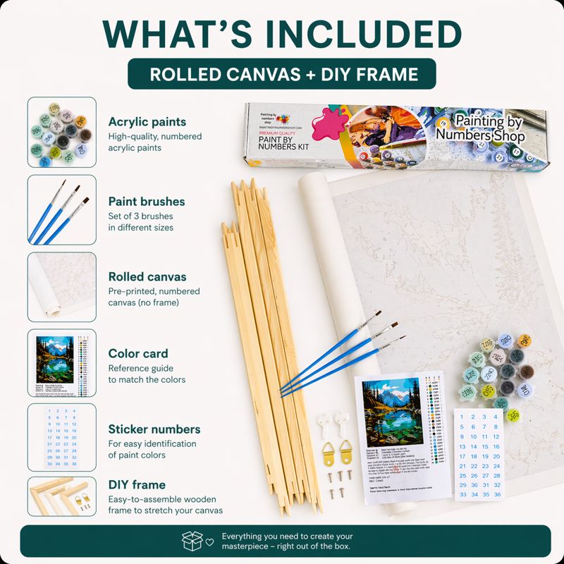 Elke set wordt geleverd met een vooraf bedrukt canvas op basis van je geüploade foto, een volledige set bijpassende acrylverf en drie penselen. Je kunt ook optionele items toevoegen zoals een houten lijst of een voorgespannen canvas.