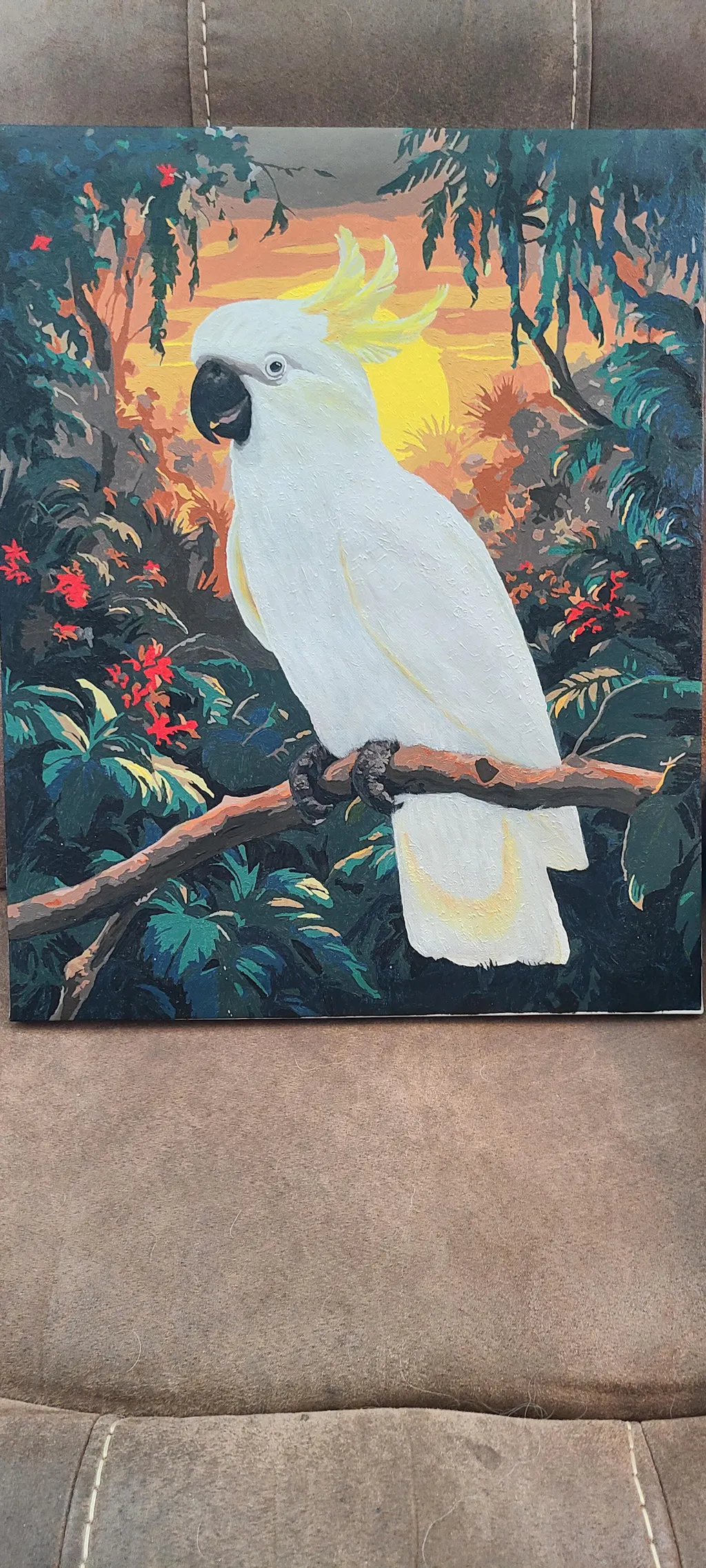 Quirky Cockatoo is a paint by numbers kit that turns your next DIY project into a bold, tropical masterpiece. A creamy white cockatoo with vibrant yellow crest feathers stands out against deep green leaves. Surrounding the bird are lush hibiscus blooms in bright red and golden yellow. The contrast between the soft feathers and vivid flowers adds rich texture and depth. This paint by numbers kit is an easy and satisfying way to create artwork that feels playful and full of character.