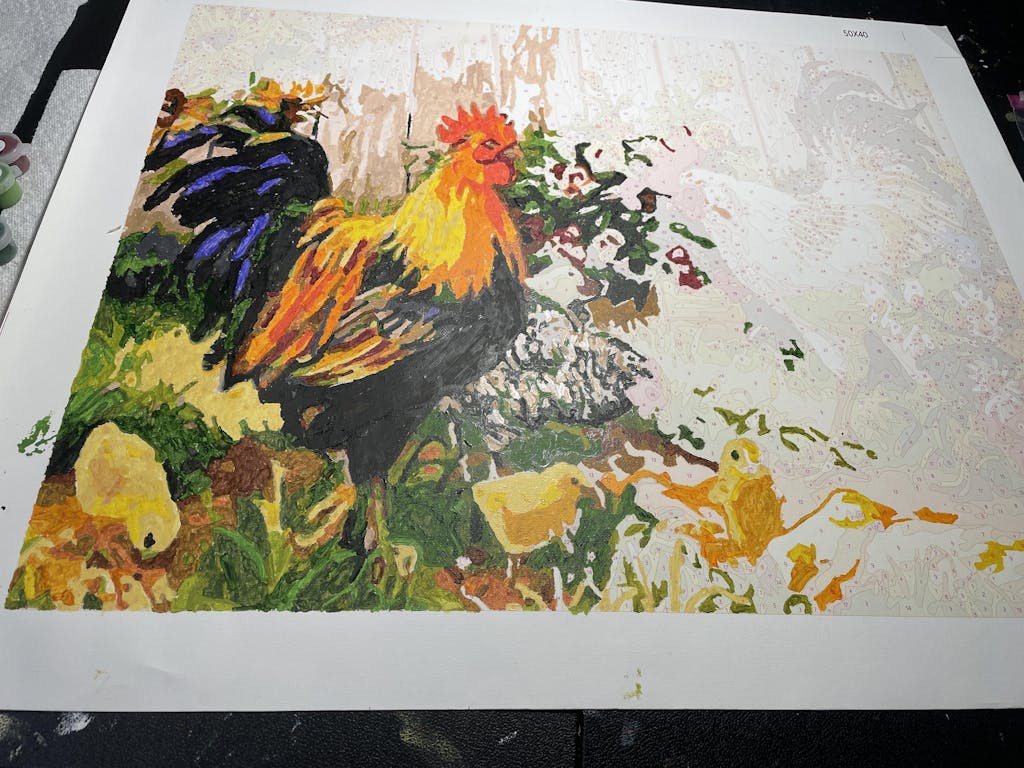 You are introducing our vibrant Roosters and Chicken Paint by Numbers Kit for adults! This engaging set features a beautiful farmyard scene, teeming with lively roosters and hens, waiting for your personal touch. Suitable for every beginner and seasoned artist alike, this kit offers a relaxing, creative experience that will help develop your painting skills.