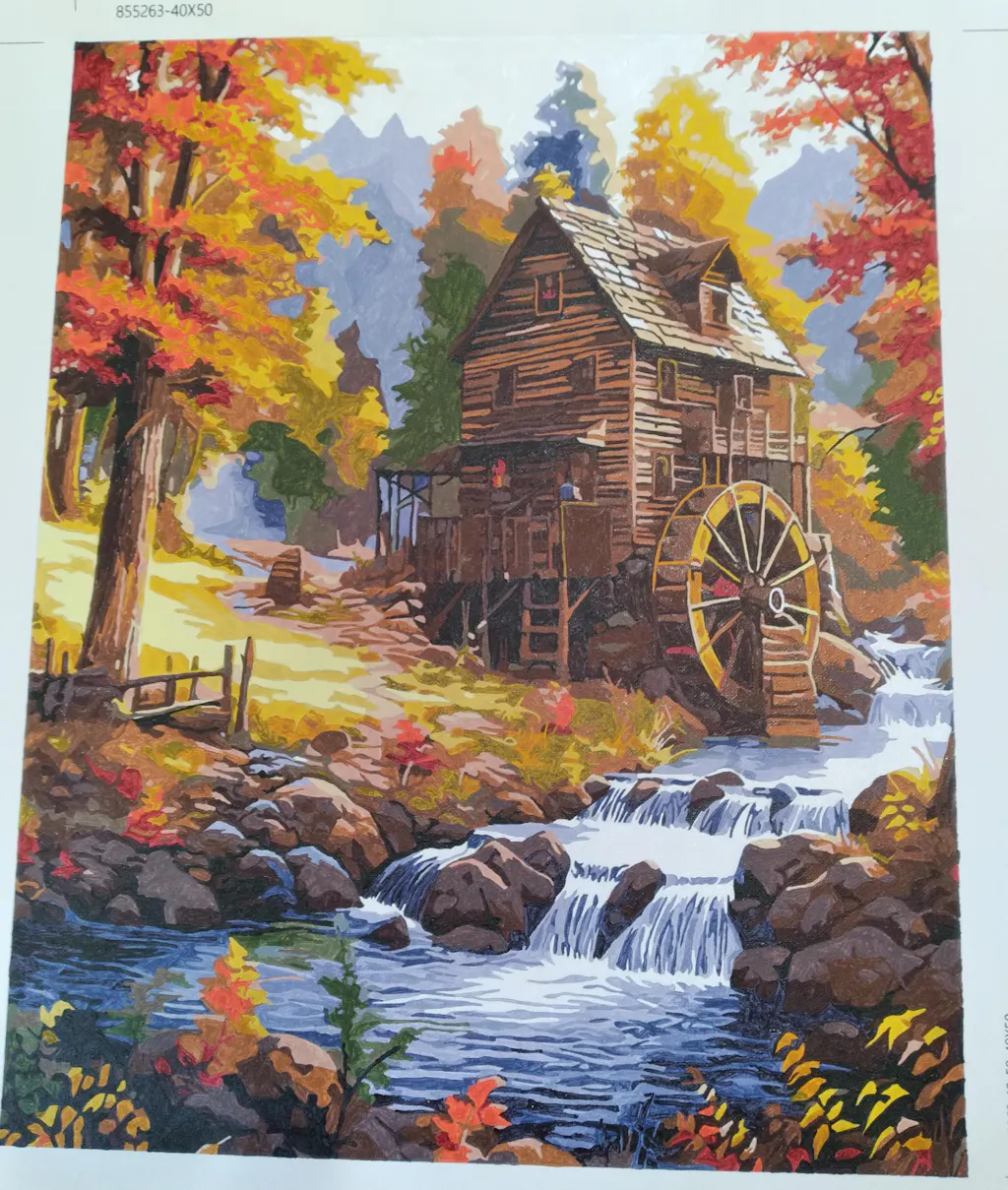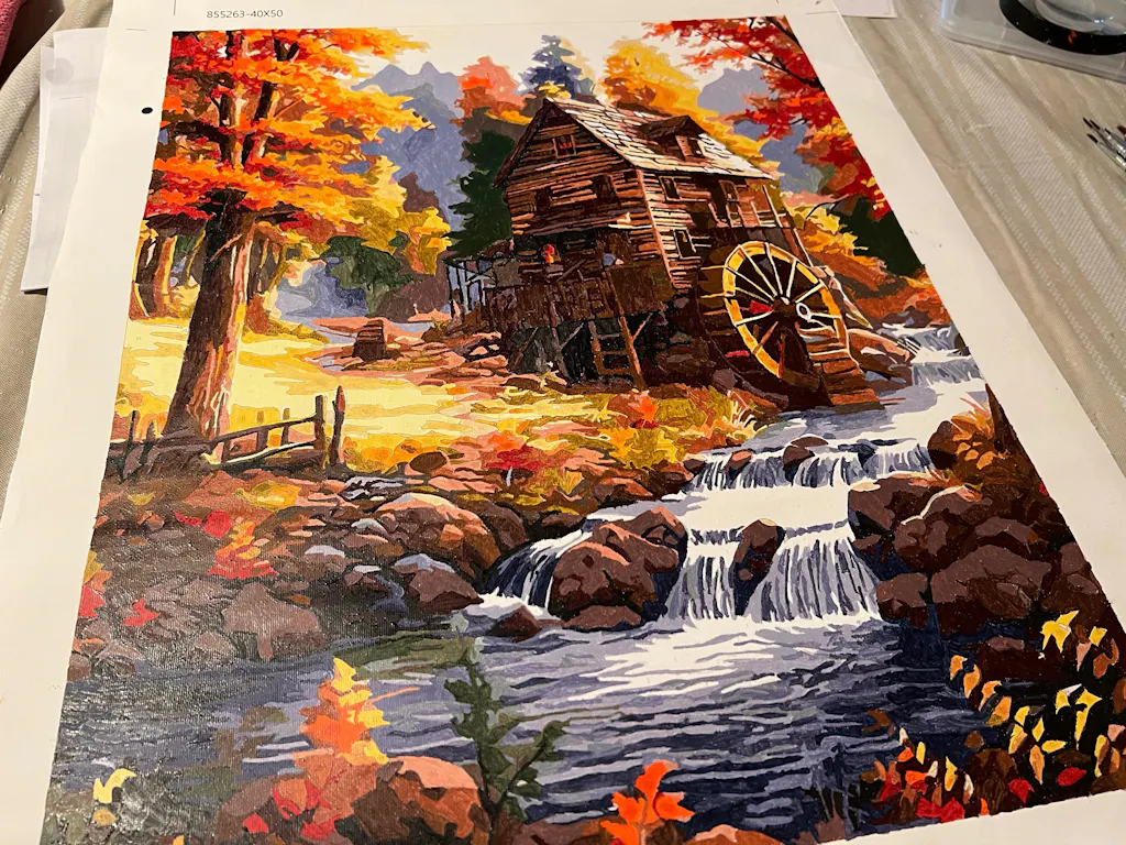 The Water Mill paint by numbers kit is a peaceful choice for any beginner looking to create calming artwork with guided ease. A rustic wooden mill sits beside a flowing creek, surrounded by vivid autumn trees and rocky paths. Water tumbles gently over the stones, drawing the eye toward the detailed structure and its large turning wheel. Golden foliage and soft light add warmth to the entire scene. Whether you're a new artist or simply enjoy quiet moments, this paint by numbers kit offers a satisfying way to create your own finished piece.
