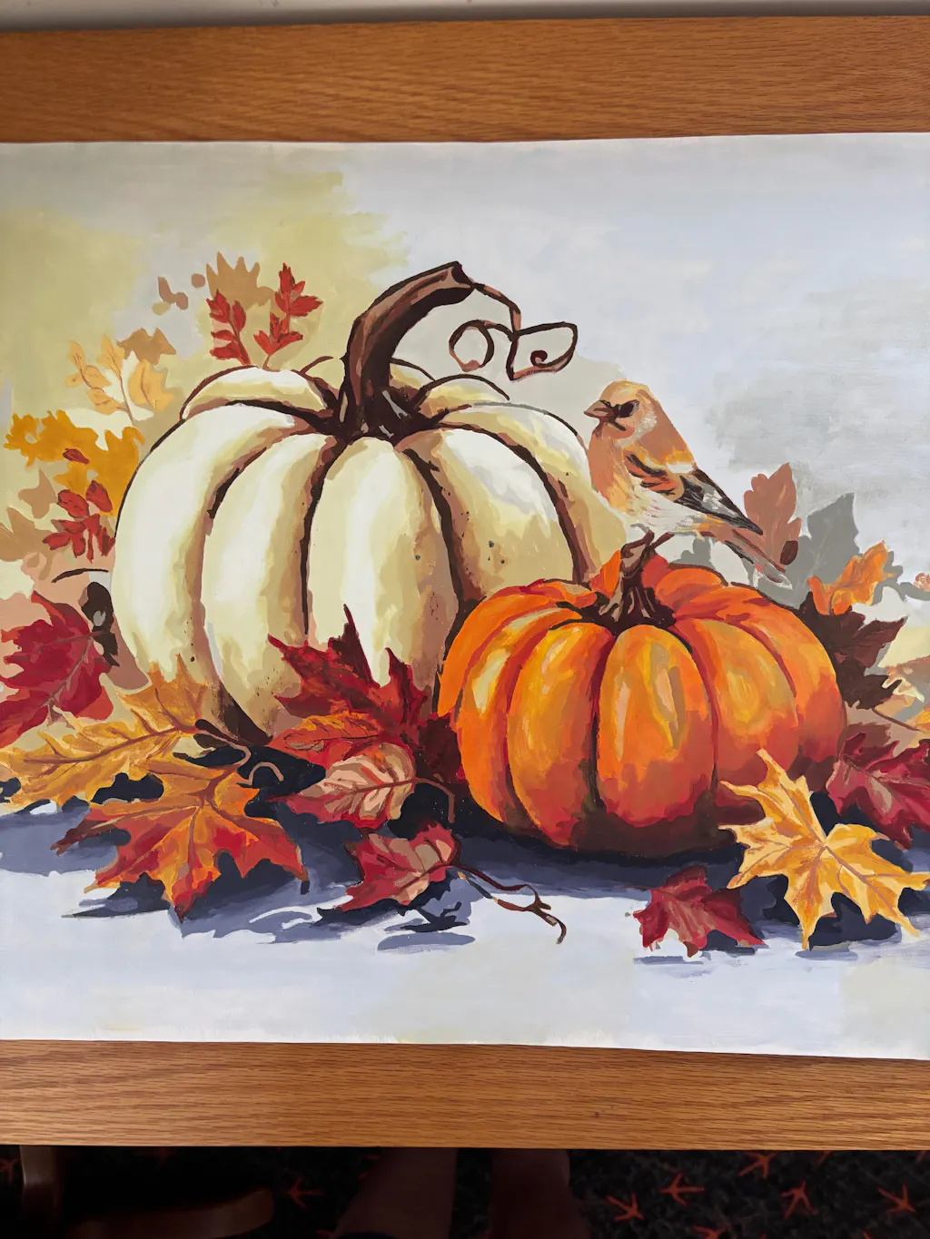 The Whispers of Autumn paint by numbers kit is a relaxing watercolor-style project perfect for beginners and hobby artists. Two pumpkins sit among fallen leaves in warm seasonal tones, with a small goldfinch perched gently on the orange one. Rich reds, yellows, and earthy browns create a cozy atmosphere ideal for autumn-themed decor. The soft, artistic background enhances the delicate lines and natural textures. This DIY art kit offers a simple and rewarding way to enjoy creative time at home.